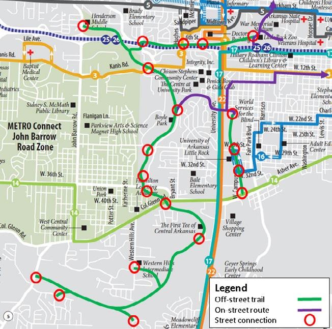 Figure 2. The Tri-Creek Greenway improves transit access and addresses the “last mile problem,” connecting with Rock Region METRO routes 3, 5, 8, 14, 16, 17 and 22. Street connections are shown with red circles.