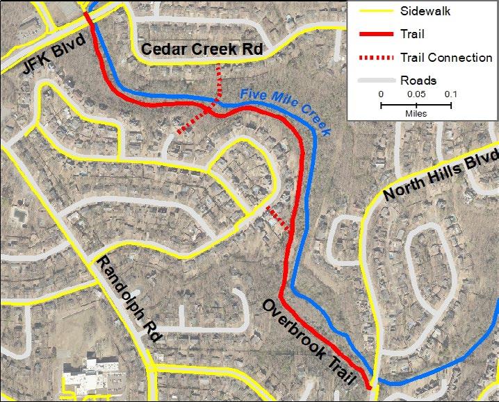 If you live in central-north North Little Rock, you may be familiar with the Overbrook Trail, a ¾ -mile stretch of bike / ped trail that stretches from JFK Boulevard to North Hills Boulevard along the path of Five-Mile Creek. Short trails connect the Overbrook Trail into the street grid of nearby neighborhoods.