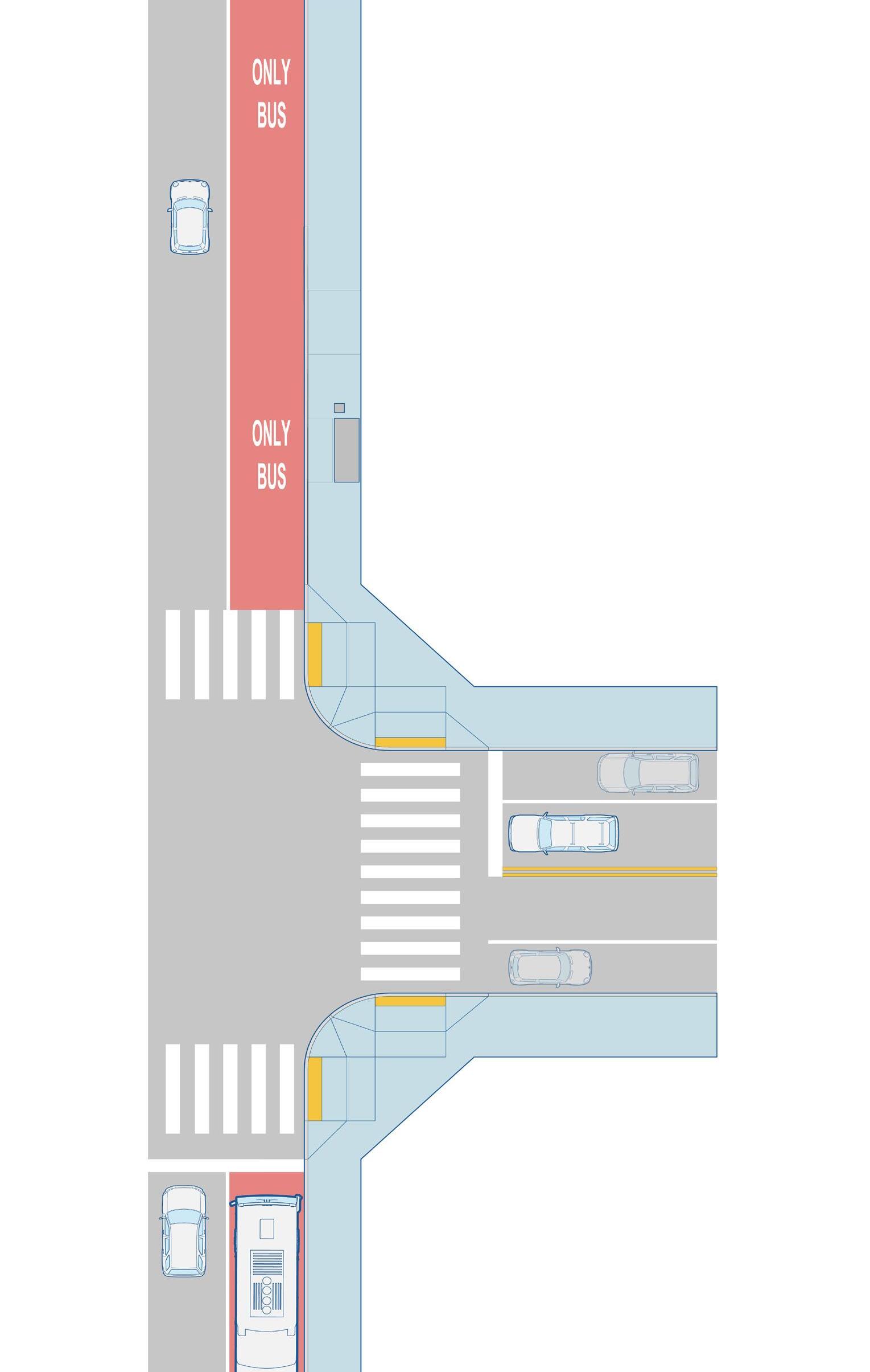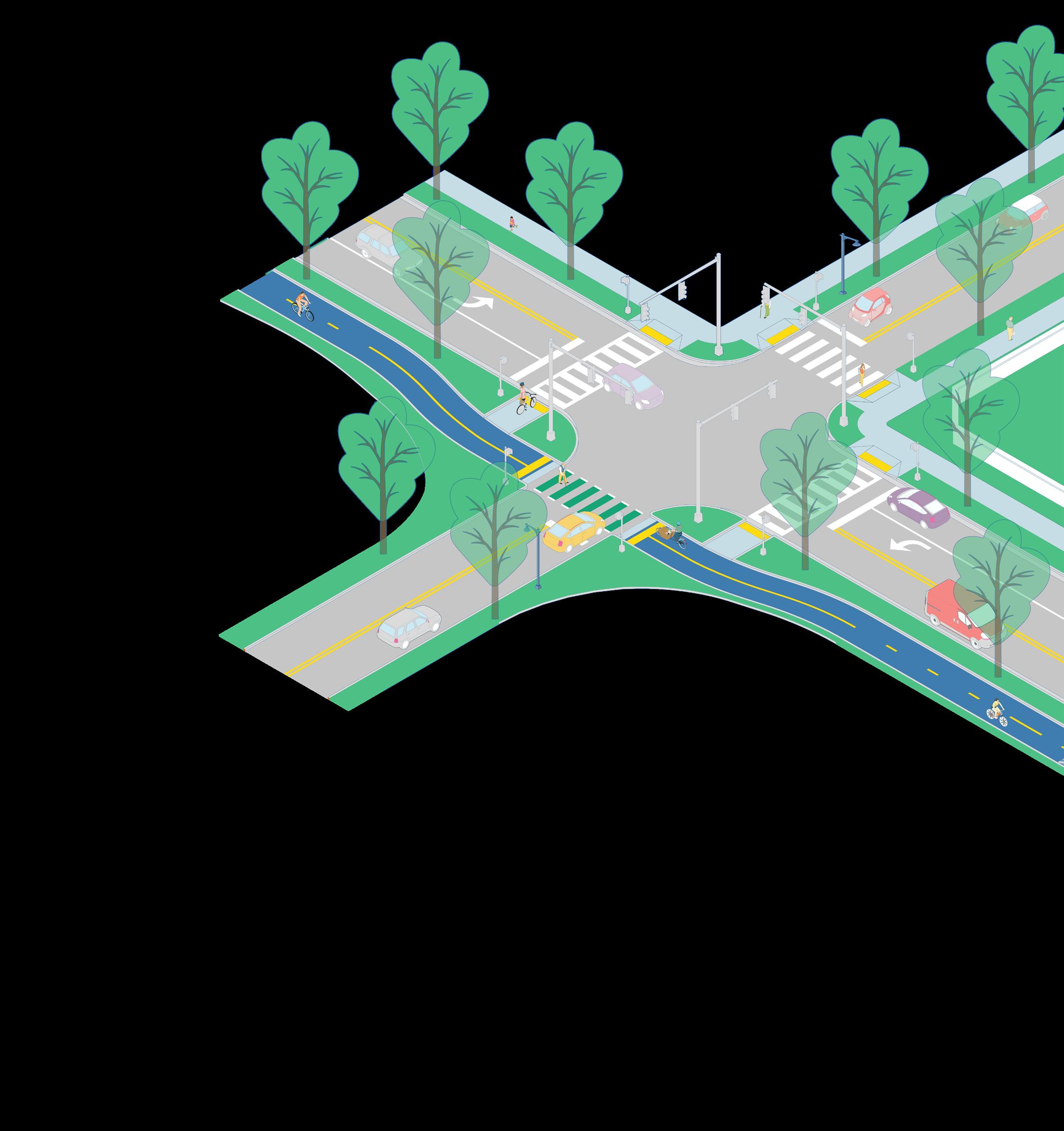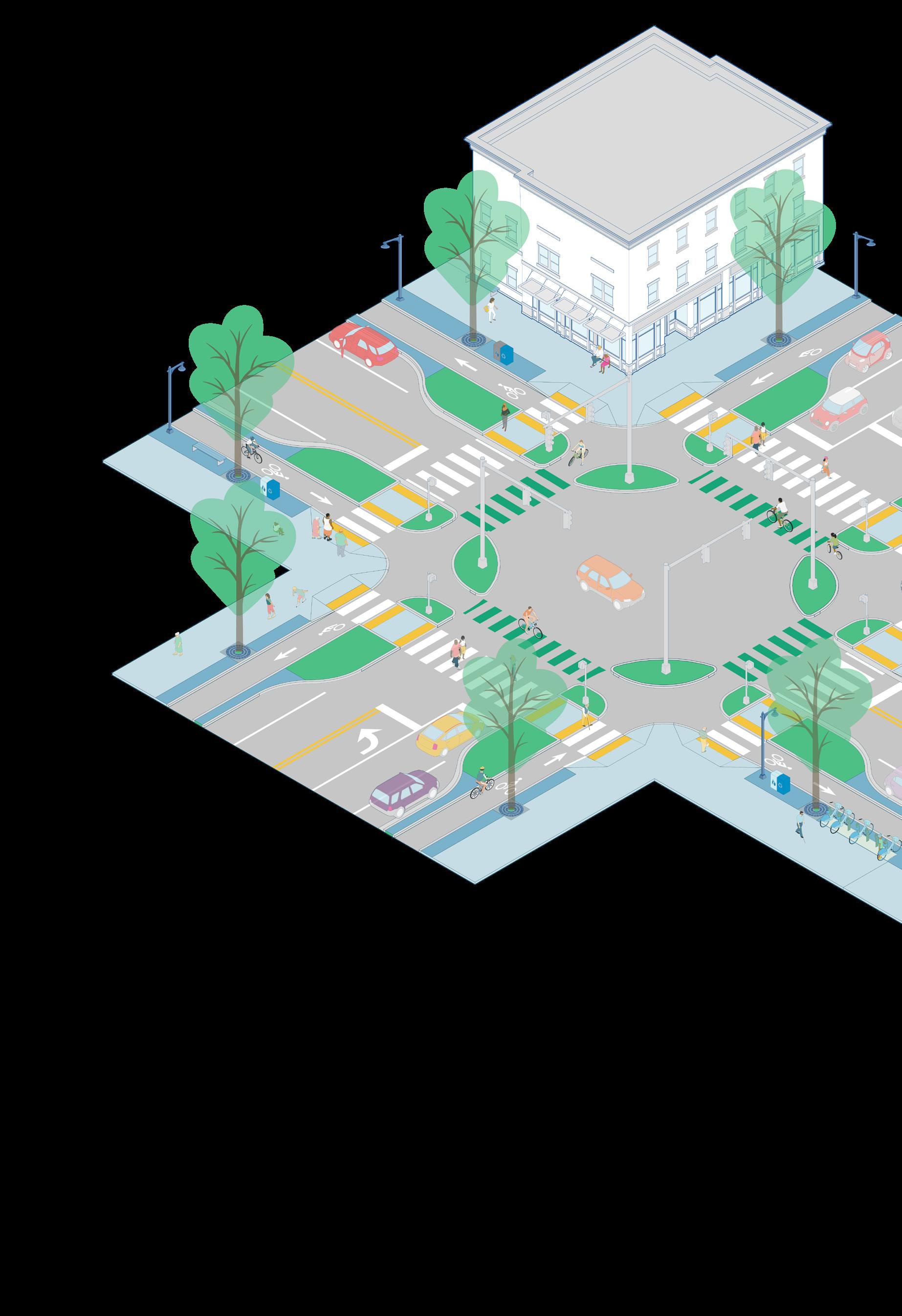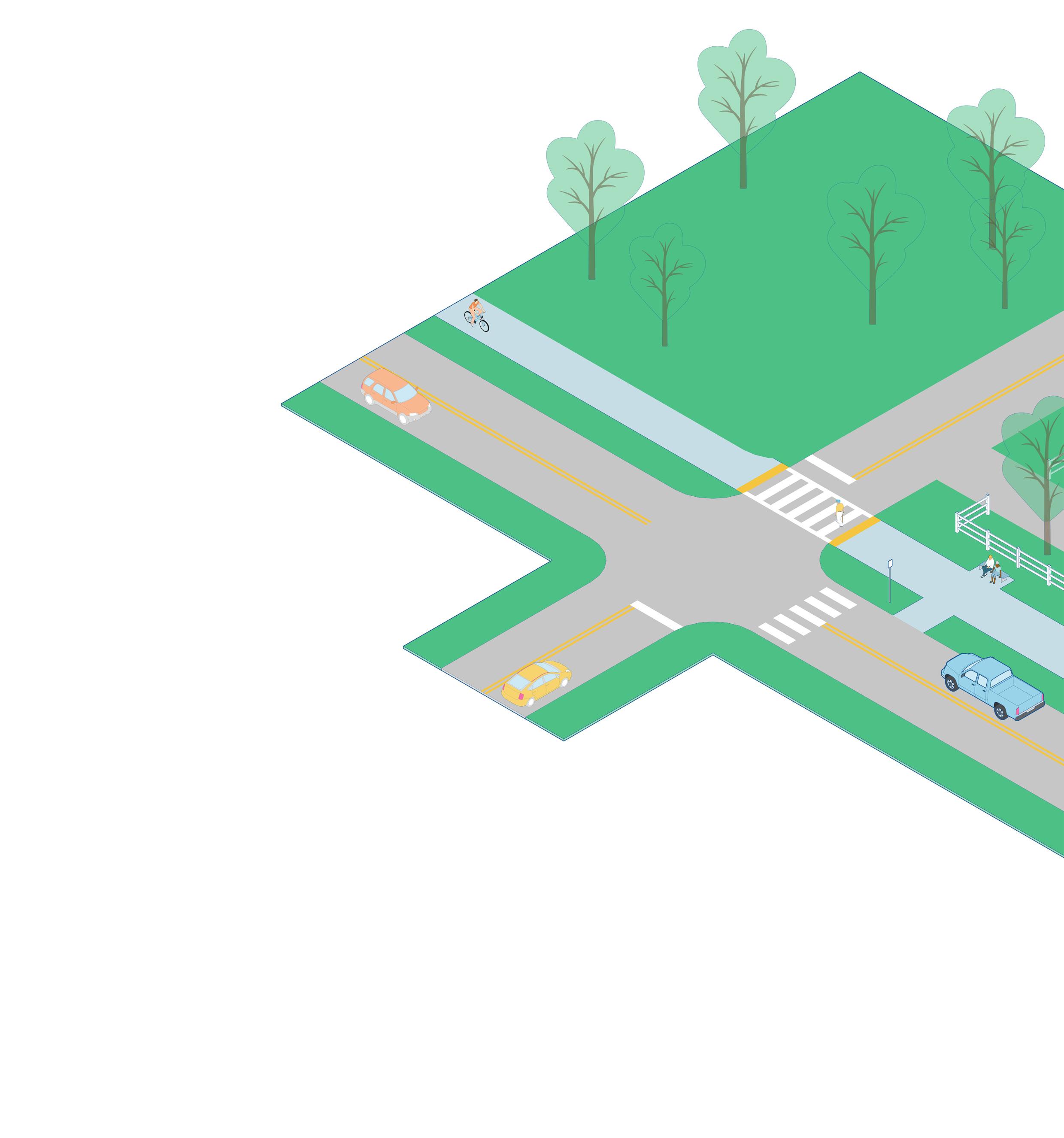 » Design vehicle right turns for use at slow speeds and use mountable features to accommodate design vehicles while keeping turning speeds low.