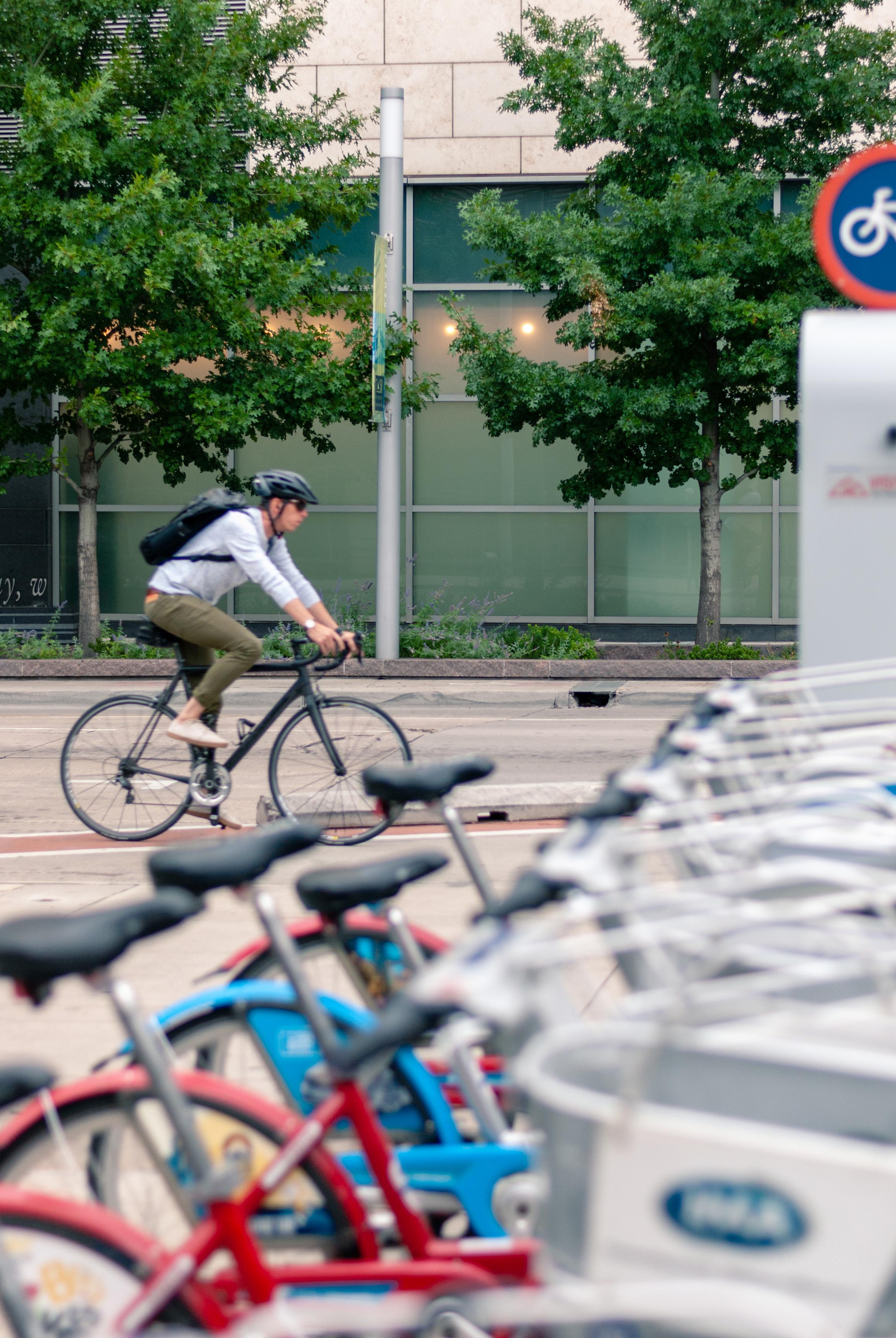 Bicycle and scooter share parking supports the transit system by providing an affordable and efficient way to make the first- and last-mile connection. Available dedicated parking also deters random and/or inappropriate parking such as leaving a scooter in the middle of a sidewalk or locking a bicycle to a light pole or tree. Placement and design should be consistent with BF2: Bicycle Parking and should be considered as part of an overall approach to curbside management.