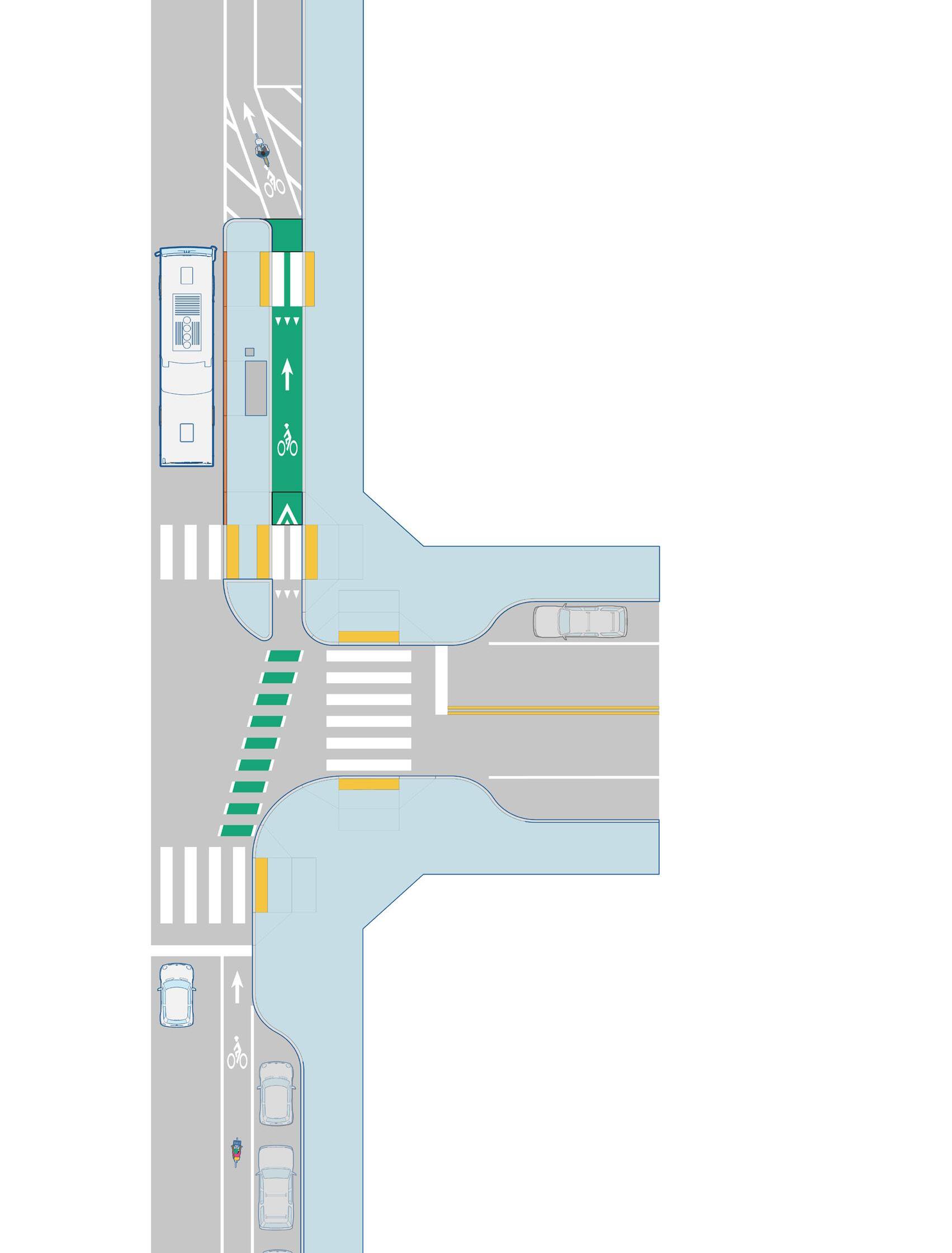 » Locate outside of the vehicle path of travel, between the bike lane or Urban Trail crossing and crosswalk. If necessary, relocate the crosswalk, curb ramps, and vehicle stop bar behind the queue area to maintain an ADA-accessible path.