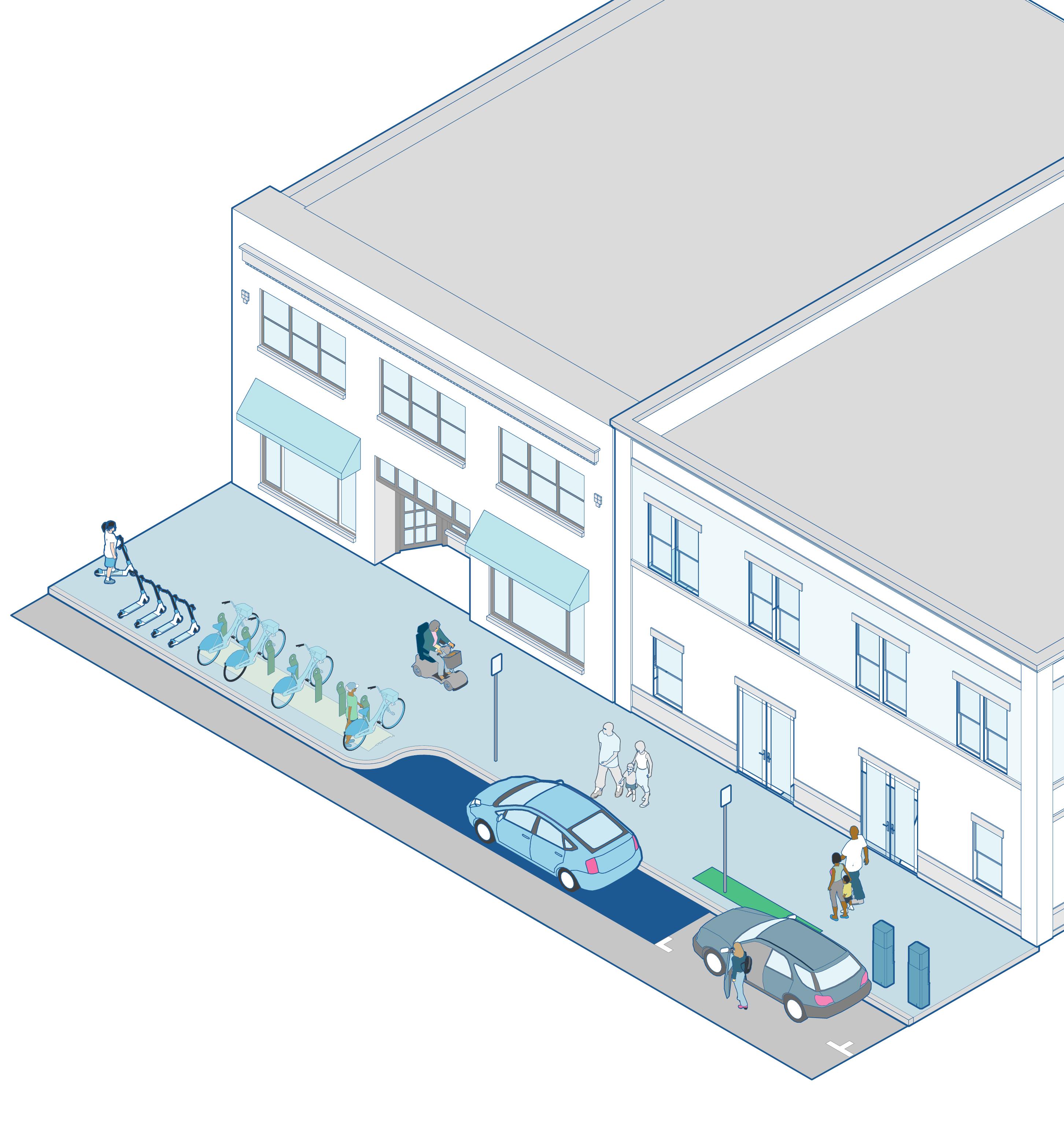 Curbside activities, whether it be micromobility (bicycle or scooter) parking, freight loading/delivery, or ride share pick up and drop off, contribute to the vibrancy of local streets and support the local economy. Because the curbside is a limited resource, management is particularly important in corridors that experience high levels of multimodal activity.
