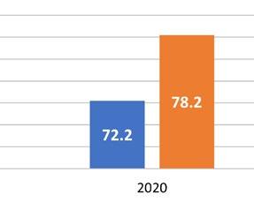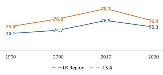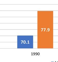 The final chart compares male and female life expectancy in Central Arkansas in 1990 and 2020. While male life expectancy remains lower, it has risen by more over the thirtyyear timeline. The local life expectancy figures were derived by Metroplan from mortality data provided by the Arkansas Department of Health. Mortality figures for years since 2017 remain provisional and are subject to continuing minor revisions.