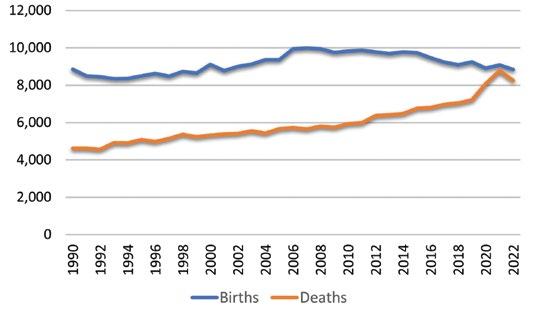 As you can see below, in 1990 there were nearly 9,000 births, versus about 4,600 deaths—almost two for one. By 2014 the ratio was down to about three births for every two deaths. When covid-19 hit, mortality jumped while births continued