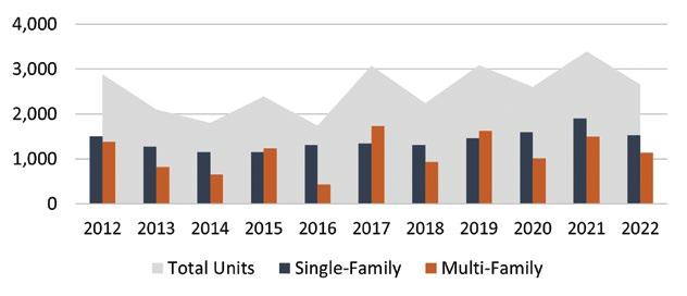 Multi-family permits were down also, dropping 24 percent from nearly 1,500 units in 2021 to about 1,100 in 2022. As usual the bulk of multi-family new construction activity was in the largest cities: Little Rock, North Little Rock, and Conway. The region is also seeing a minor increase in “missing middle” housing units like duplexes, triplexes and four-plexes. In summary, multi-family accounted for 43 percent of new units being built in the region during 2022.