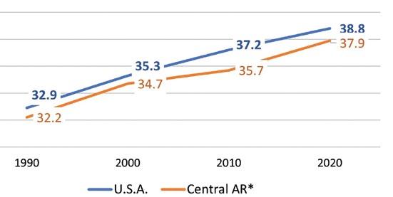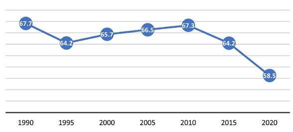 age. The chart below shows how this figure has declined in Central Arkansas from about 67.7 in 1990 to 58.5 in 2020.