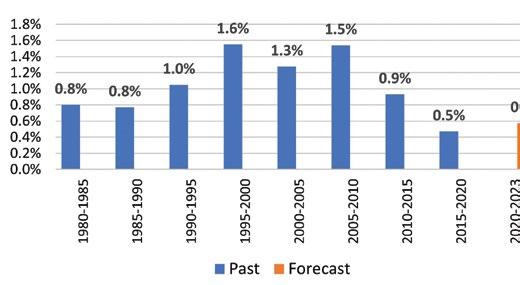 Past in-migration to Central Arkansas has been driven in part by general U.S. (and even global) population growth. The most likely forecast shows global population reaching approximate stability by 2050, and it could even begin declining after about 2100. U.S. population growth is running slower than the global average. With such “background” population growth