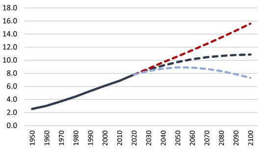 Global Population 1950–2020 With UN Forecasts to 2100 (in billions)