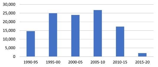 Central Arkansas Net Migration 1990–2020 (Five-Year Intervals)
