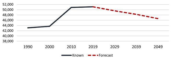 Not only is fertility declining, but the large Millennial generation will soon pass beyond the most fertile childbearing ages (typically 20 to 29). The chart at right tracks the region’s population of young women in these age groups. Females 20 to 29 rose by about 16 percent from 2000 to 2010, and grew again slightly to 2019. Underlying demographic factors suggest, however, that the population of females in childbearing ages will likely decline over the next thirty-odd years.