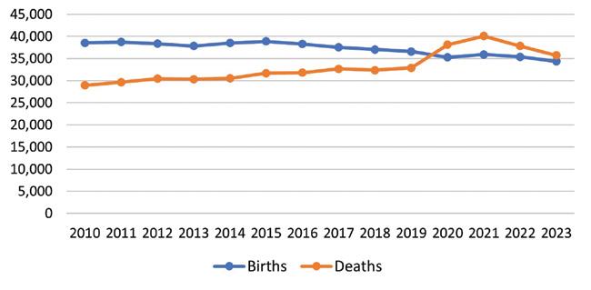 The “components of change” table below depicts population change by its demographic elements: births, deaths and migration. As you can see, migration accounted for a gain of about 20,000 people, the bulk of population growth. Natural increase, or the surplus of births over deaths, was about 2,300. As the chart shows, births remained higher than deaths although the margin was close in 2021. Total deaths in 2023 were down 11.2 percent from 2021, the year when deaths spiked the most due to Covid-19.