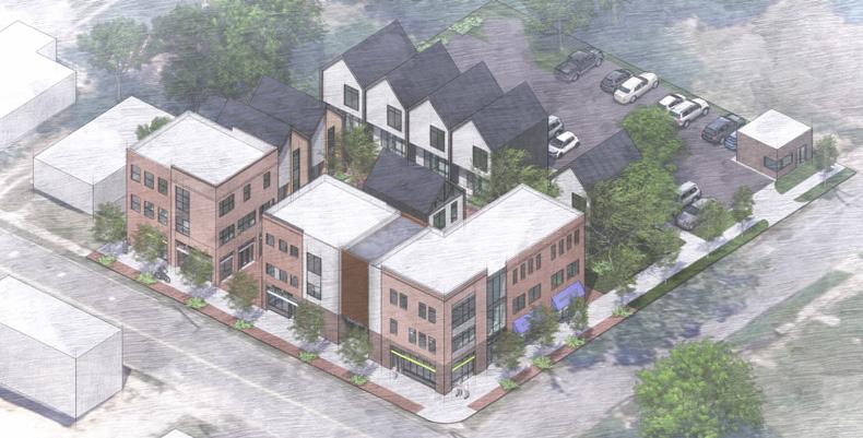 for the development is nestled behind the townhouses screened from Rock Street by landscaping and a micro commercial building facing the street.