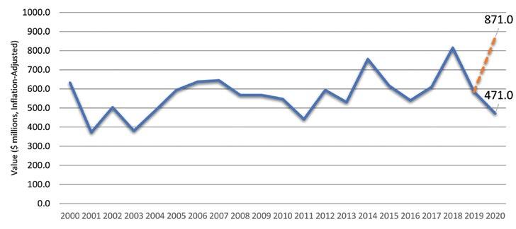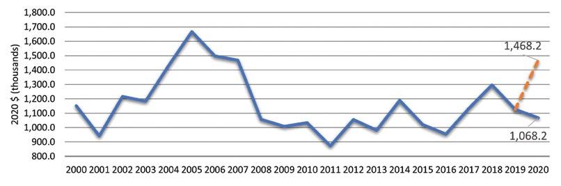 Little Rock MSA Construction Value 2000–2020 (2020 dollars)