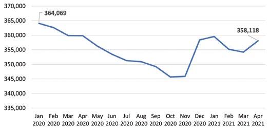 The labor force—the cadre of people working or wanting to work—declined during the pandemic and has yet to fully recover. From a bottom-out of 346,000 in late fall 2020, the local labor force had climbed to about 358,000 by April 2021. This remains about 6,000 lower than it was prepandemic, in January 2020.