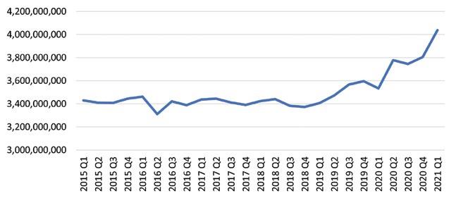 Some retail sectors—like restaurants—were hit hard by the pandemic, yet regional retail sales in early 2021 topped $4 billion, well above the $3.4 billion average during the 2015–2019 period. Local sales showed some evidence of ticking up before Covid-19 hit, possibly due to a change in state tax law that boosted revenues from online sales. Sales sagged in the second quarter of 2020 amid lockdown conditions but have surged since then, and local activity has surged well ahead of the U.S. average. Rapid sales growth was boosted by federal fiscal stimulus during 2020 and early 2021. As federal largesse winds down in coming months, retailing will probably down-shift at least a bit. It will be a local sector to watch.
