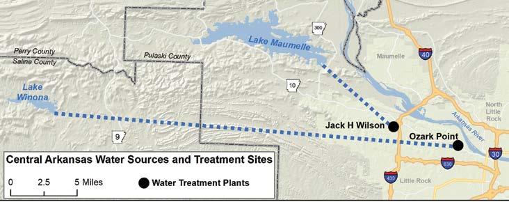 Maumelle in Pulaski County just west of Little Rock. These two lakes, and the treatment facilities that serve them, provide a potential supply of 157 MGD (million gallons daily), 20 percent above peak demand.