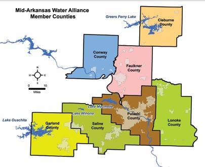 The cover image depicts the spillway at Lake Winona, located in the Ouachita National Forest in northern Saline County. The lake can provide up to 24 million gallons of water daily (MGD) for Central Arkansas Water, the region’s largest water utility. Lake Winona was developed in the 1930s by the City of Little Rock. Lake Maumelle, developed in the 1950s, can provide up to 133 MGD. The region’s water supply remains abundant, clean, and inexpensive thanks in part to long-range planning performed nearly a century ago.