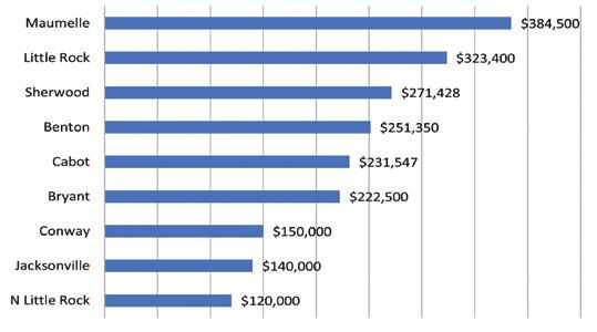 Single-family permit median values for the region hit a new peak in 2022 of $246,805. Median value by city varies substantially, though. As the chart at right shows, while the median for new homes was well over $300,000 in Maumelle and Little Rock in 2022, homes were being built for $150,000 and under in Conway, Jacksonville and North Little Rock.