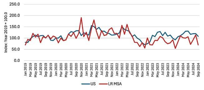 The table at bottom left shows year-over-year singlefamily housing permits. Little Rock granted permits to 339 new single-family homes in the most recent year-to-year interval: October 2023 through September 2024. Benton ranked second with 223, and North Little Rock ticked up with 175, about 55 percent higher than the previous year. All other cities saw net gains except Conway and Sherwood.
