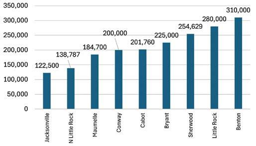 $230,000 was about seven percent lower than the 2022 value of $247,000. Within the region, new home values varied by city. Benton claimed its first-ever place as the highest-valued market, at $310,000. Maumelle has often topped these charts but was remarkably affordable at $184,700, with a large share of townhomes. The most affordable cities for new homes were Jacksonville and North Little Rock, at $122,500 and $138,800, respectively.