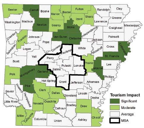 1.Arkansas.com. 2. The map is based on each county’s share of total state tourism tax revenue in proportion to the county’s share in state GDP. Source for tourism tax data: Arkansas Department of Parks and Tourism. GDP data from U.S. Bureau of Economic Analysis.