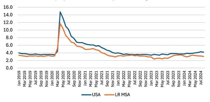 The chart below depicts September 2024 job change over the previous September. The Little Rock MSA logged job growth 2.2 percent above September 2023. This outpaces the region’s previous growth from 2015 to 2019. It was also faster than both the U.S. average (1.5 percent year over year) and the Northwest Arkansas metro area (1.9 percent). It may be a blip. Historically the Northwest Arkansas job trend has been more volatile, with higher highs and some sharp slowdowns, too.