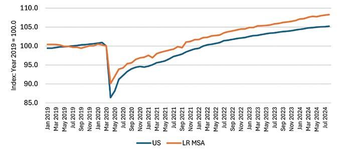 The Central Arkansas region is prospering, with job and income growth running steadily. By some measures, such as job momentum, the region is running just a bit faster than the U.S. average. For example, Central Arkansas saw year-overyear job growth of 2.2 percent for August 2024, compared with a U.S. average of 1.5 percent. Employment growth in the past two years has run slower, however, than in the 2020–2022 years when the regional and U.S. economies were recovering from the Covid recession.
