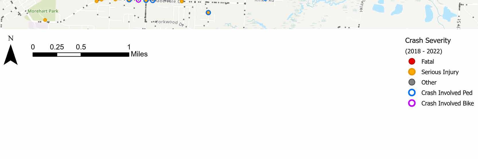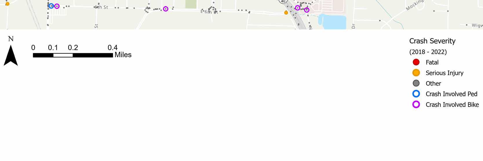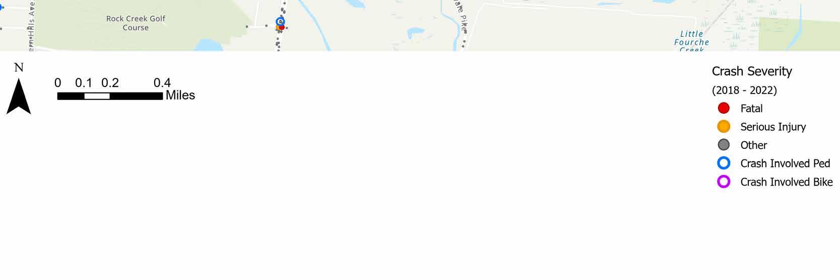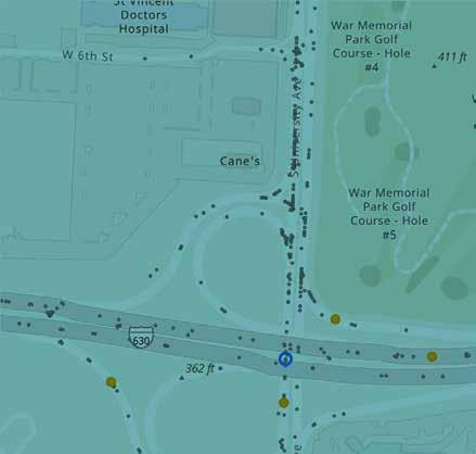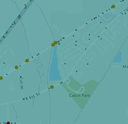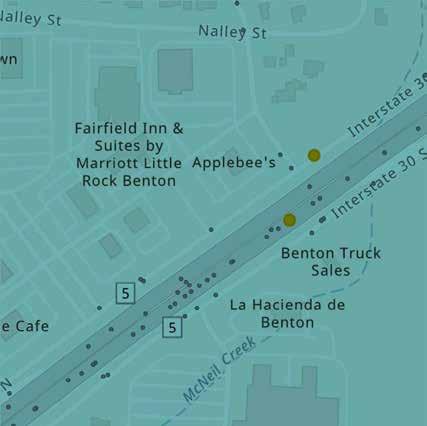 Location-specific projects were developed for the Pulaski County Supplemental County Level Plan in order to address safety improvements within specific areas. These projects were identified by considering the highest scoring HIN segment within each city in Pulaski County and the highest scoring HIN segment in unincorporated Pulaski County. However, if the County or a city expressed the need for a different segment within their jurisdiction to be prioritized, that location was selected based on the agency’s input. The projects listed in Table 4 were recognized by stakeholders as having the greatest need for safety improvements within their respective jurisdictions. For each location-specific project identified in Table 4 that is not already included in the Central Arkansas Safety Action Plan, additional detail has been included on the subsequent pages. Detail includes a crash map of the segment, count of crashes on the segments from 2018 to 2022, and suggested countermeasures. As noted earlier, the full list of countermeasures can be viewed in Section 5 - Safety Countermeasures Toolbox of the Central Arkansas Safety Action Plan.