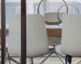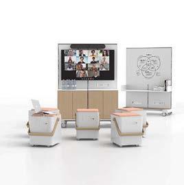 The Ocular collection (opposite) includes unique table shapes designed for hybrid collaboration, improving sightlines and creating a more equitable experience for in-person and remote meeting participants. Technology integration is key in Steelcase’s reimagining of products for individual workstations (above) and conference rooms (left) that are designed for the camera as much as for the people in the room.