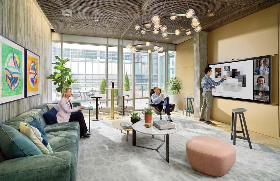 deep technology integration in its effort to keep pace with change. That, the company says, means rethinking traditional paradigms such as conference rooms so that they work for everyone who is in-person and remote—designing for the camera as much as for people in the room.