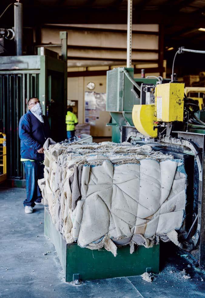 Opposite: Depending on its structure and composition, carpet is broken down into three main components at Aquafil’s facilities: polypropylene, calcium carbonate, and Nylon 6. Left: Because carpet isn’t designed to be recycled, Aquafil had to develop custom machinery to take the products apart.