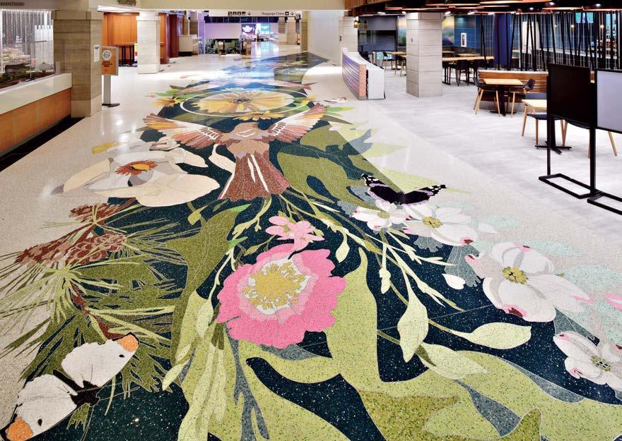 A glorious celebration of the state’s natural beauty, this public art depicts 16 native insects, 12 plants, and a pair of mockingbirds, all centered on a compass plant, in 50 epoxy terrazzo colors and 50 different mixes of aggregate, with mother-of-pearl and recycled glass for texture. Pattern elements in “Over an Arkansas Sky”—a tribute to state poet laureate Jo McDougall—range from spots no bigger than a dime on butterfly wings to five square feet. ntma.com