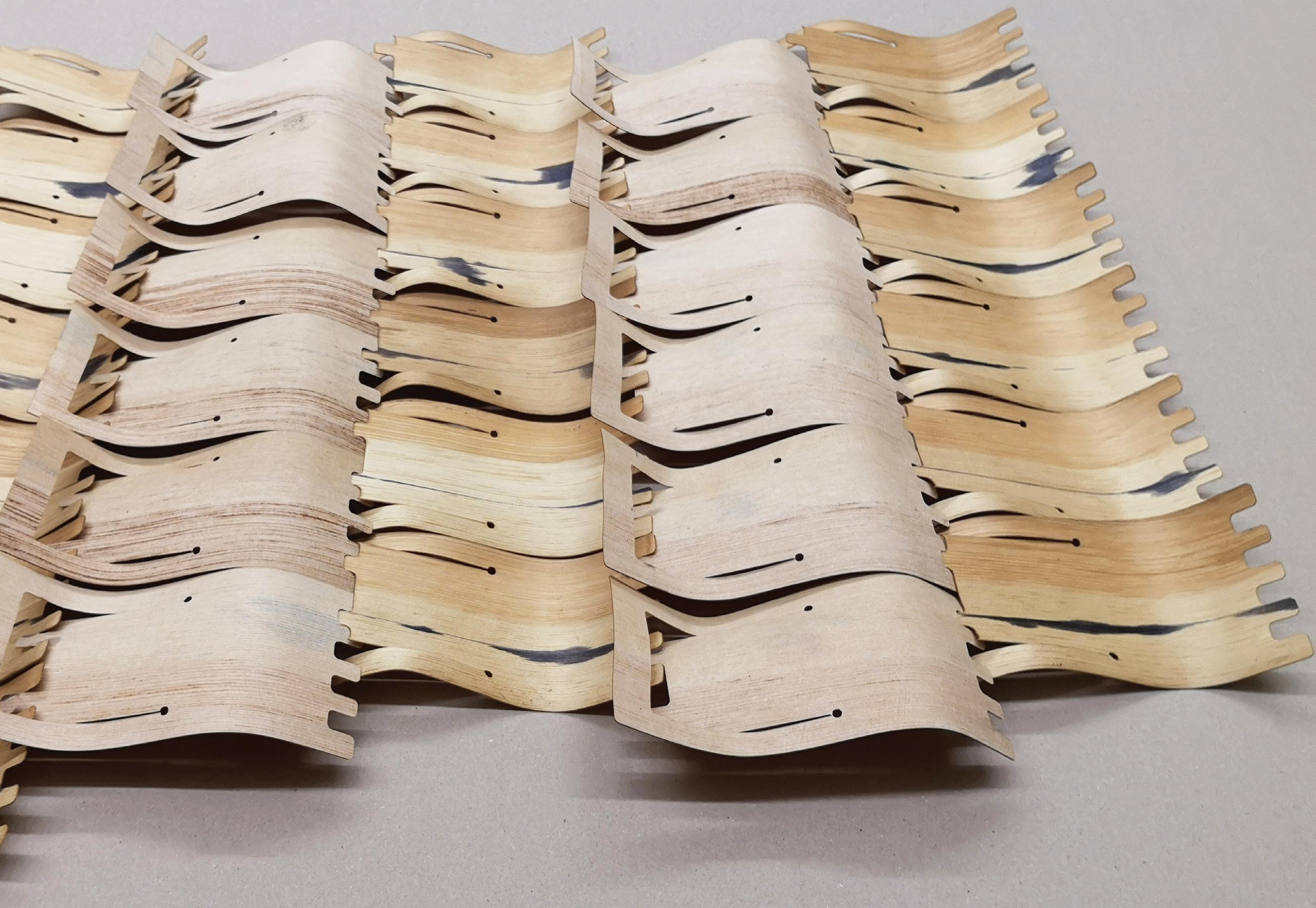 Kósa Lili Környezetkultúra BA, „TERMÉSZET A BELSŐ TEREKBEN” (Témavezető: Deli Ágnes) című kutatása egy ökologikus, természetes anyag kísérlet, mely szorosan együtt működik egy térbeli struktúra megalkotásával. Figyelembe vette a kagyló sajátosságait, textúráját, színeit, formavilágát és egy olyan elemrendszert tervezett, mely sorolható és szabályos, illetve szabálytalan mintában egyaránt variálható. Anyaga zselatinból, glicerinből és vízből áll, illetve fő komponensei még a tojáshéj és a kávézacc, amely a karakterét adja. Az anyaghasználatnál a természetes anyagok felhasználását és újrahasznosítását tűzte ki célul, melyek a mindennapi életben is nagy mennyiségben előfordulnak.