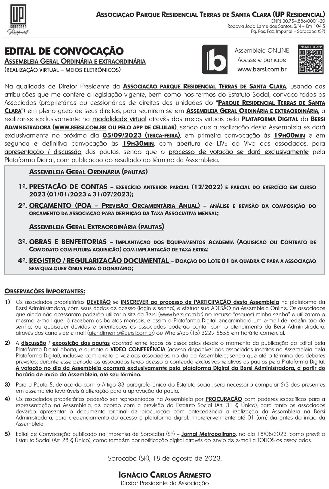EDITAL DE CONVOCAÇÃO DE ASSEMBLEIA GERAL ORDINÁRIA DA COOPERATIVA DE TRABALHO DOS CATADORES E CATADORAS DE MATERIAIS RECICLÁVEIS DE SALTO DE PIRAPORA, com sede na Rua Maria Francisca dos Santos Marcello, 290–Nhá Cota, CEP 18.160-000, Salto de Pirapora/SP, CNPJ n.º 05.200.901/0001-40 e NIRE 35400058340, convoca todos os seus cooperados para comparecerem as ASSEMBLEIA GERAL ORDINÁRIA que se fará realizar em 29/08/2023 às 09:00hs na Rua Maria Francisca dos Santos Marcello, 290–Nhá Cota, CEP 18160-000, Salto de Pirapora-SP, para deliberarem sobre a seguinte pauta: 1Prestação de Contas do Conselho de Administração e Conselho Fiscal do anos de 2021 e 2022; 2- Eleição do Conselho Fiscal; 3-Eleição do Conselho de Administração; 4- Assuntos gerais da Cooperativa. Salto de Pirapora, 18/08/2023. Isa Rodrigues de Almeida Pereira – Presidente.