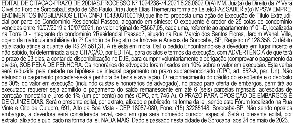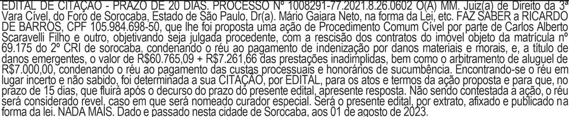 EDITAL DE CITAÇÃO - PRAZO DE 20 DIAS. PROCESSO Nº 000744169.2023.8.26.0602. O(A) MM. Juiz(a) de Direito da 2ª Vara Cível, do Foro de Sorocaba, Estado de São Paulo, Dr(a).JOSE CARLOS METROVICHE, na forma da Lei, etc.FAZ SABER a(o) TATIANA RAMOS PEREIRA, Brasileira, Divorciada, Técnica em Química,RG 24.462.526-8, CPF 247.030.138-60, que por este Juízo, tramita de uma ação de Cumprimentode sentença, movida porJosé Américo Todaro Galante . Encontrando-se o réu em lugar incertoe não sabido, nos termos do artigo 513, §2º, IV do CPC, foi determinada a sua INTIMAÇÃO por EDITAL, para que, no prazo de 15 (quinze) dias úteis, que fluirá após o decurso do prazo dopresente edital, pague a quantia de R$ 8.806,04, devidamente atualizada, sob pena de mul ta de 10% sobre o valor do débito e honorários advocatícios de 10% (artigo 523 e parágrafos, doCódigo de Processo Civil). Fica ciente, ainda, que nos termos do artigo 525 do Código deProcesso Civil, transcorrido o período acima indicado sem o pagamento voluntário, inicia-se oprazo de 15 (quinze) dias úteis para que o executado, independentemente de penhora ou novaintimação, apresente, nos próprios autos, sua impugnação. Será o presente edital, por extrato,afixado e publicado na forma da lei. NADA MAIS. Dado e passado nesta cidade de Sorocaba, aos 10 de julho de 2023.