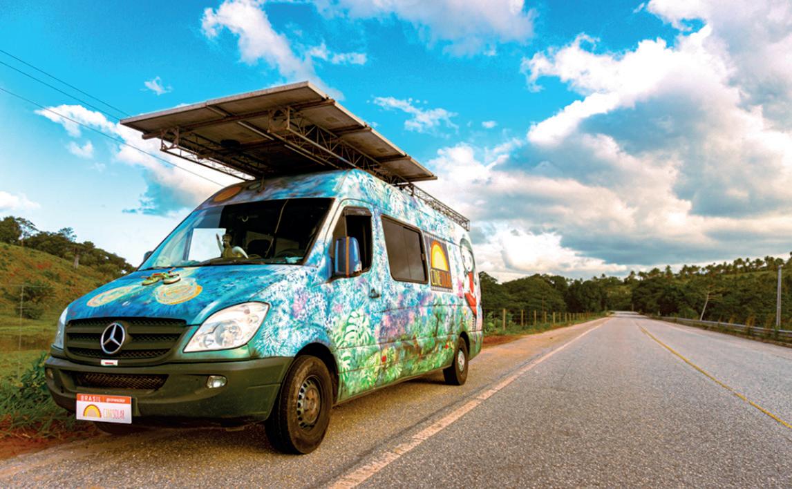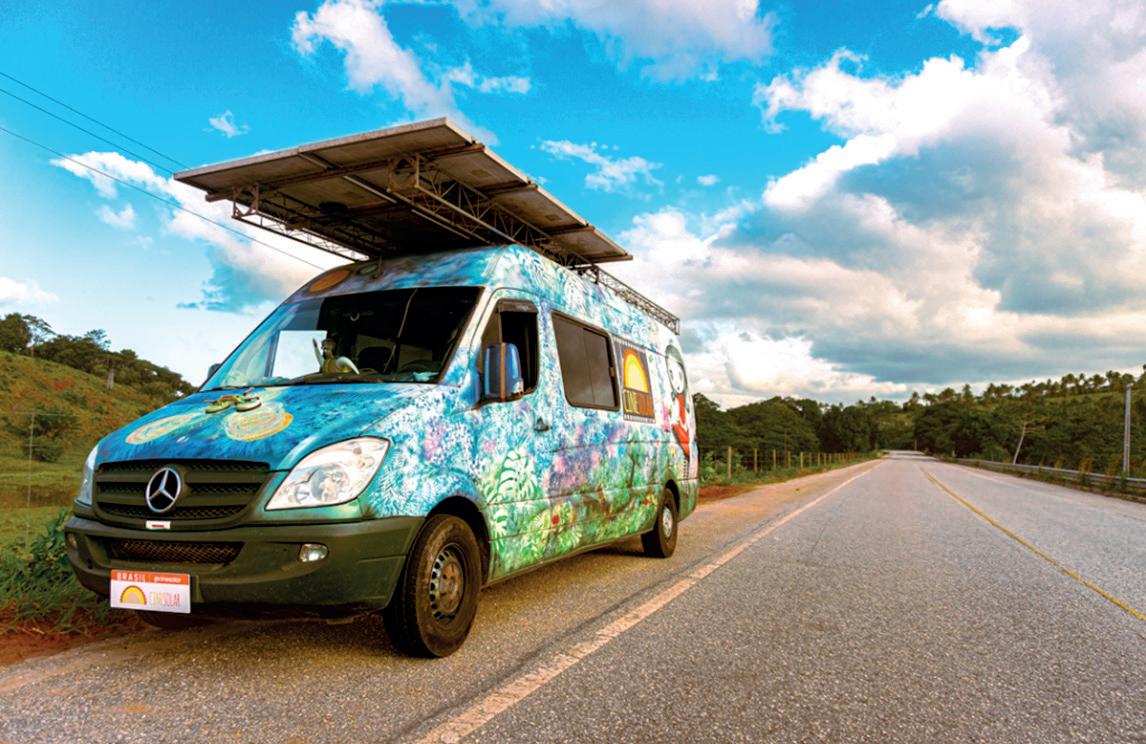 renovável, é melhor ainda”, completa. O furgão, uma estação móvel de ciências, arte, tecnologia, sustentabilidade e cultura de paz, é o protagonista responsável pela magia do CineSolar. O veículo é adaptado com as placas fotovoltaicas no teto e carrega todo o cinema: as cadeiras e banquetas, os sistemas de conversão de energia e armazenamento, de som e projeção, incluindo a tela. Suas luzes coloridas, a decoração de material reciclado e os objetos com princípios de magnetismo e eletricidade (laser e bola de plasma) ensinam, de forma lúdica, como a luz do sol se transforma em energia elétrica.