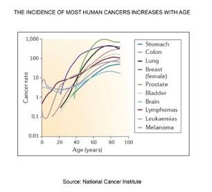 Aging is a leading risk factor for developing cancer. Around the world, the median age of a cancer diagnosis is 65 years old, with the highest rates in people between 85-89. According to the World Health Organization, people over age 60 will number over 2 billion by 2050, drastically increasing the global burden of cancer.