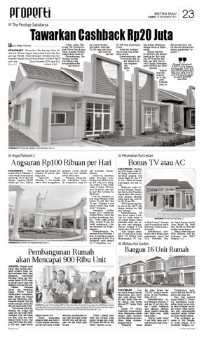 gin memiliki rumah,” ujarnya. Selain itu, lanjutnya, pihak developer memberikan kemudahan berupa DP yang bisa diangsur selama 6 kali dalam waktu 6 bulan. DP minimal 20 persen dari harga jual dan booking fee Rp20 juta. Saat ini, lanjutnya, rumah yang dibangun sudah terjual 40 unit dari total 70 unit. “Terdapat 6 unit rumah contoh yang ready stock,” terangnya. Sedangkan fasilitas berupa mini waterboom, outdoor fitness, taman dan fasilitas pendukung lainnya. “Jalan sudah paving block, securty 24 jam dan listrik undeground. Konsep bangunan ala Eropa,” paparnya. Ditambahkannya, Perumahan Royal Platinum 2 akan mengadakan pameran gabungan di Mal SKA Pekanbaru pada tanggal 22- 27 Desember. (iko)