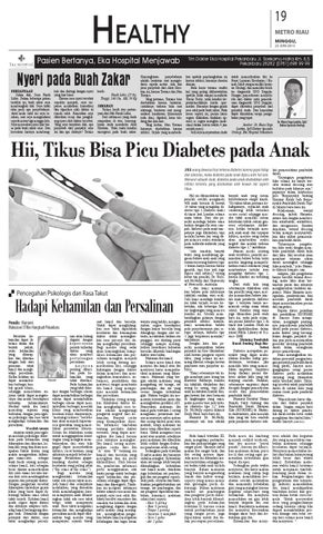 Hadapi Kehamilan dan Persalinan Penulis : Mairianti Mahasiswi STIKes Hangtuah Pekanbaru Peristiwa kenan akan hilang hamilan dapat didiganti dengan terima dalam dua kepercayaan bentuk pokok, pernuh terhadap yaitu kehamilan dokter yang yang diharapakan memberi kan dan diterima pertolongan dengan baik atau persalinan. perasaan takut Anjuran hamil dan menghpenting diberiadapi persalinan. kan pada keKedua keluhan ini hamilan yang Mairianti dapat menimbultidak diterima. kan berbagai benPada kehamilan tuk gejala klinis, yang tidak ditersehingga memerlukan an- ima dengan berbagai alasan juran untuk dapat mengata- dapat menimbulkan berbagai sinya dan mulai beradaptasi alasan dapat menimbulkan terhadap kehamilannya. berbagai alasan dapat menNasihat untuk ibu hamil imbulkan berbagai masalah mencakup anjuran yang klinis yang memberatkan berkaitan dengan pencegah- keadaan klinis diantaranya, an psikologis dan rasa takut “morning sickness” berlebimenghadapi kehamilan dan han akan menjadi hiperempersalinan. esis gravidum yang memerMasalah umum lukan perawatan khusus. Anjuran untuk pencegah- Selain itu dilakukan usaha an masalah psikologis diber- untuk menggugurkan kandikan pada kehamilan yang ungan yang mungkin memdiharapkan dan diterima, ke- bahayakan diri atau bila hamilan yang demikian mer- gagal dapat menyebabkan upakan faktor ikatan yang infeksi, cacat bawaan, yang makin mengeratkan hubun- akhirnya menjadi beban kegan suami-istri , sebagai luarga. Melakukan gugurbuah kasih sayang mereka, kandung disebut sebagai selama hamil, istri sebagian kejahatan yang paling jahat besar diantar memeriksakan (“the crime of the crime”) diri oleh suami tercinta karBagi mereka yang ena ikut serta mendengarkan menghendaki kehamilan anjuran dan petunjuk dokter. tidak ada alasan takut menDengan pengertian tersebut jadi hamil dan selanjutnya diharapkan timbulnya gejala melahirkan, yang dirasakan klinis yang berat dapat di- lebih membahagiakan karekurangi bahkan sama sekali na mempunyai anak dibandtidak terjadi. Keluhan hamil ingkan tidak ada rasa takut muda segera dapat diatasi tetapi tidak mempunyai dan akhirnya adaptasi terh- anak. Rasa takut mengalami adap hamil berlangsung den- kehamilan dan menghadapi gan baik. Ditambah dengan persalinan masih dapat dibepetunjuk dari dokter, rasa narkan bagi mereka yang takut menghadapi persali- mempunyai sejarah buruk