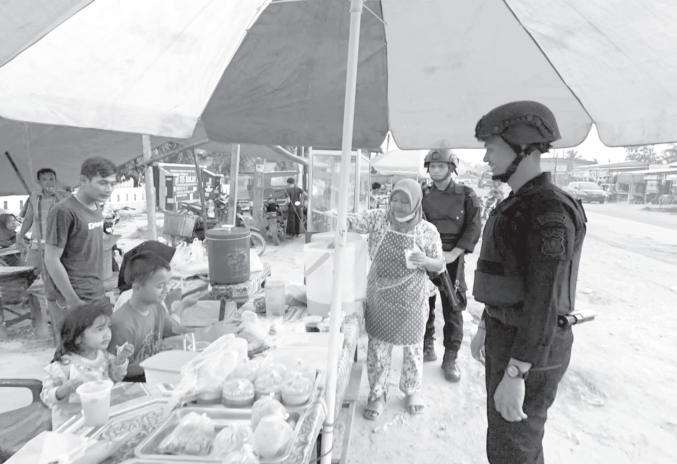 AMANKAN - Salah seorang personel Brimob Batalyon B Pelopor Sat Brimob Polda Riau mengamankan pasar Ramadan di kawasan Kepenghuluan Ujung Tanjung, Senin (27/3). (ist)