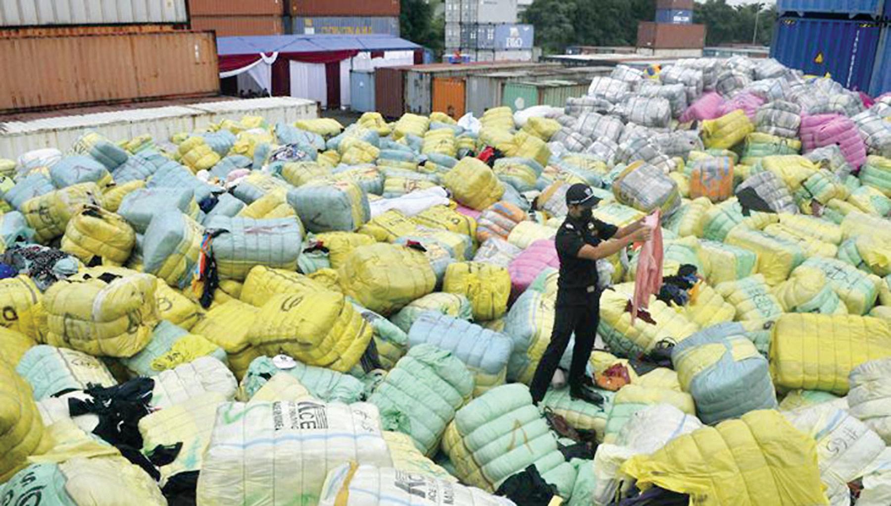 Penimbunan Pabean (TPP) Cikarang, Kabupaten Bekasi, Jawa Barat, Selasa (28/3). Bea Cukai bekerja sama dengan Badan Reserse Kriminal (Bareskrim) Polri menyita 7.363 ballpress pakaian bekas impor ilegal senilai lebih dari Rp80 miliar di wilayah Jabodetabek. (antaranews.com)