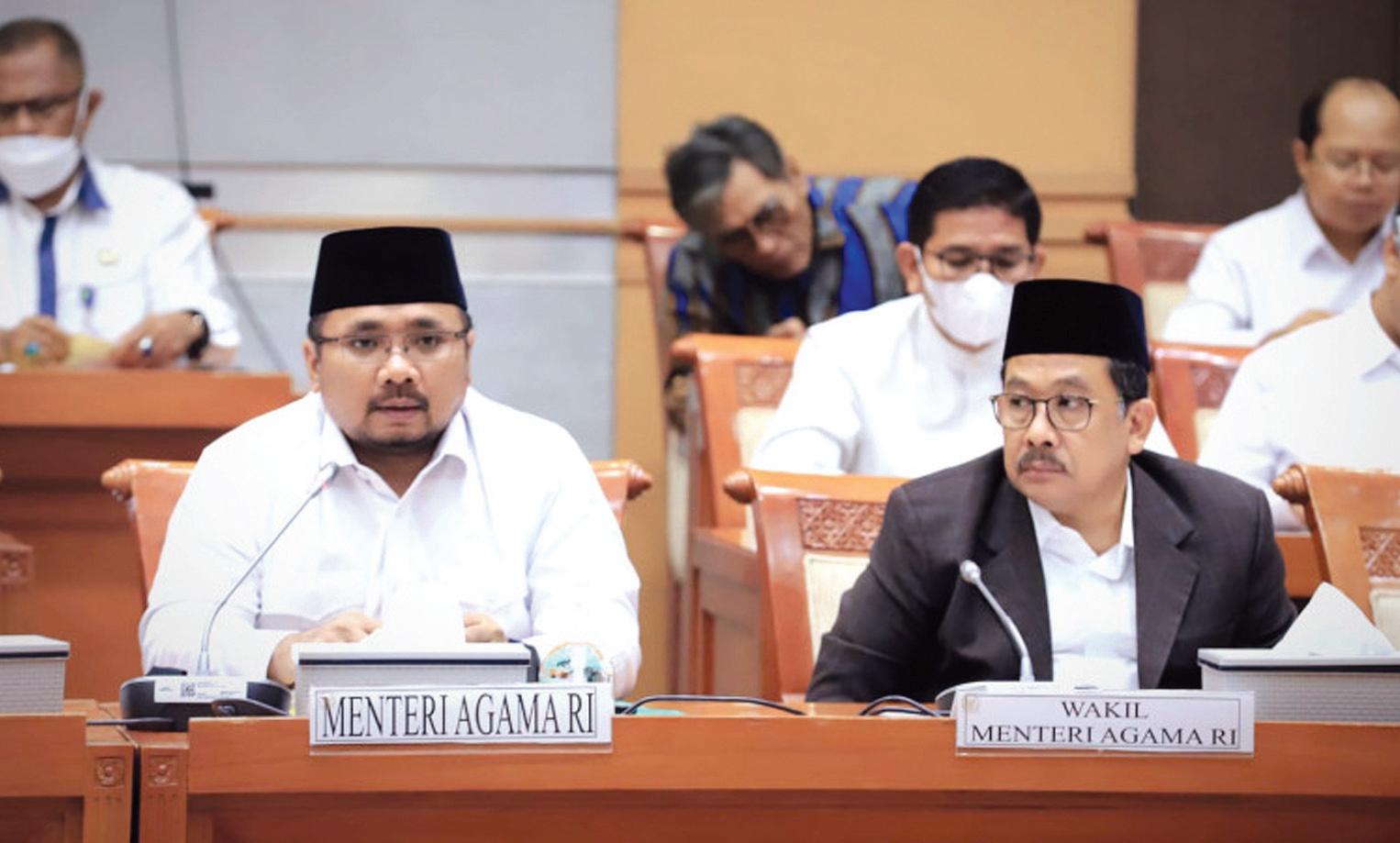 VIII DPR RI - Menteri Agama Yaqut Cholil Qoumas (kiri) bersama Wamenag Zainut Tauhid Sa’adi (kanan) menghadiri rapat kerja dengan Komisi VIII DPR RI, di Jakarta, Senin (27/3). Dalam raker tersebut Menag Yaqut Cholil Qoumas mengusulkan agar jemaah haji lunas tunda 2022 tidak perlu lagi menambah Biaya Perjalanan Ibadah Haji (Bipih) 1444 H. (kemenag.go.id)