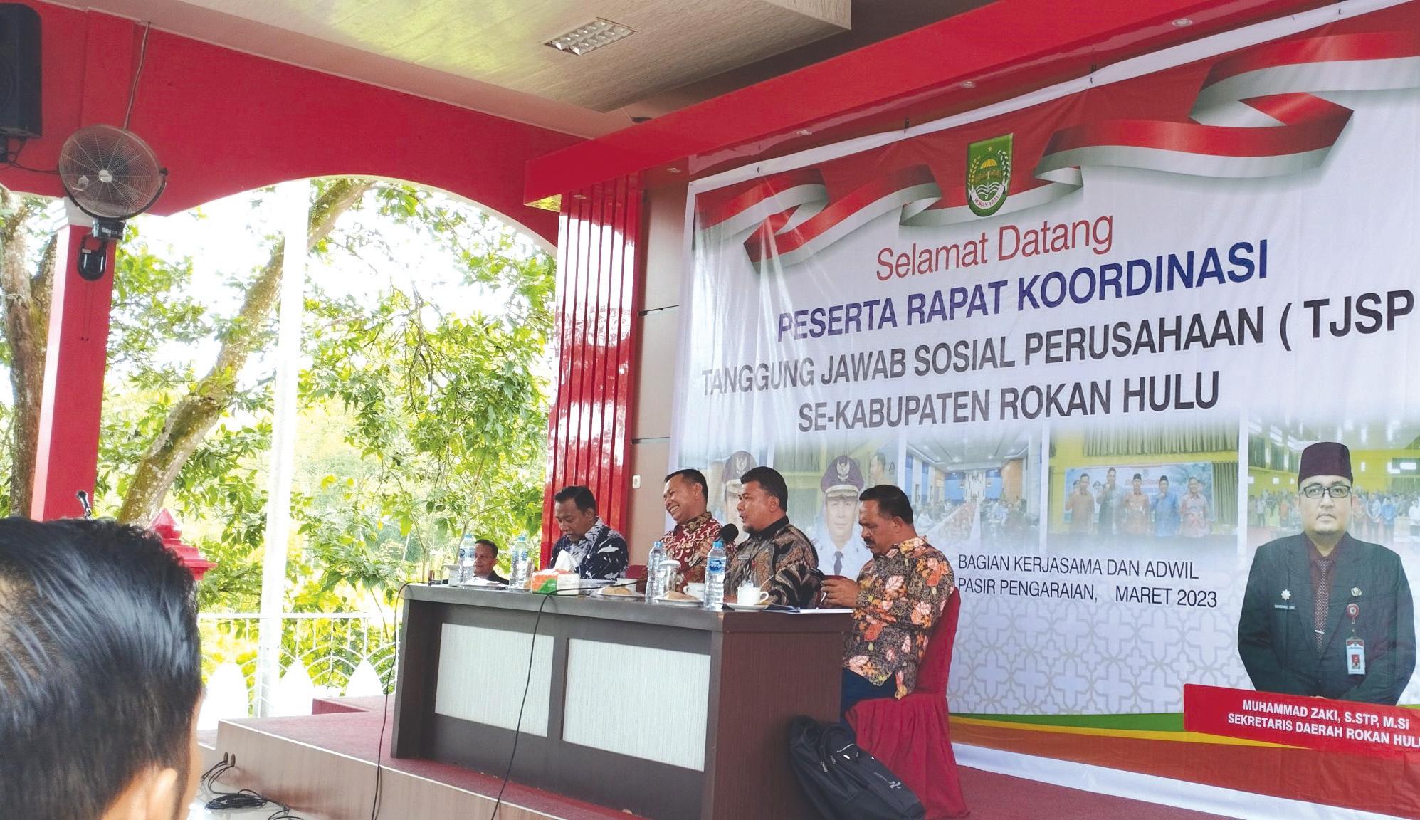sekaligus Ekspos TJSP tahun 2022 di Pendopo Rumah Dinas Wakil Bupati Rokan Hulu itu. Dalam rakor yang diikuti oleh puluhan perusahaan yang ada di Rokan Hulu itu, dipimpin langsung oleh Ketua TJSP Rokan Hulu yang merupakan Wakil Bupati Rokan Hulu H Indra Gunawan serta didampingi oleh Assisten 1 Setda Rohul H Fhatanalia Putra, Kepala Dinas Perkebunan Agung Nugroho dan beberapa Kepala Dinas maupun Badan lainnya di Lingkungan Pemkab Rohul.