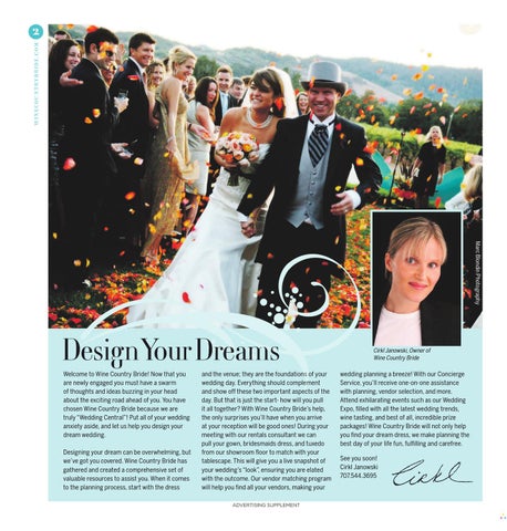 Design De esiggn Y Your o Dr our D Dreams rea eams am ms m Welcom Welcome me ttoo W Wine ine C Country ountry Bride! Now Now that t you you aree newly ar newly w engaged engaged yyou ou must must ha have ve a sswarm warm ooff thou thoughts ghts and ideas ideas buzzing in your your head h ad he about the the exciting exciting road road ahe ahead ad ooff yyou. ou. Y You oou ha have ve chosen cho sen Wine Wine C Country ountry Bride because because w wee ar aree truly “W “Wedding Wedding Central”! Central”! P Put ut all ooff yyour ourr w wedding edding anxietyy aside aside,, and let us help you design anxiet you de siggn yyour our dream dr eam w wedding. edding. Designing D esigniing your your dream dream can can be overwhelming, overwhelming, but we’ve w e’ve got got you you covered. covered. W Wine ine C Country ountry Bride B has ggathered athered e and cr created eated a ccomprehensive omprehensive sset et ooff assist vvaluable aluable resources resources ttoo as sist yyou. ou. Whenn it ccomes omes ttoo the planning p process, process, sstart tart with the dress dress