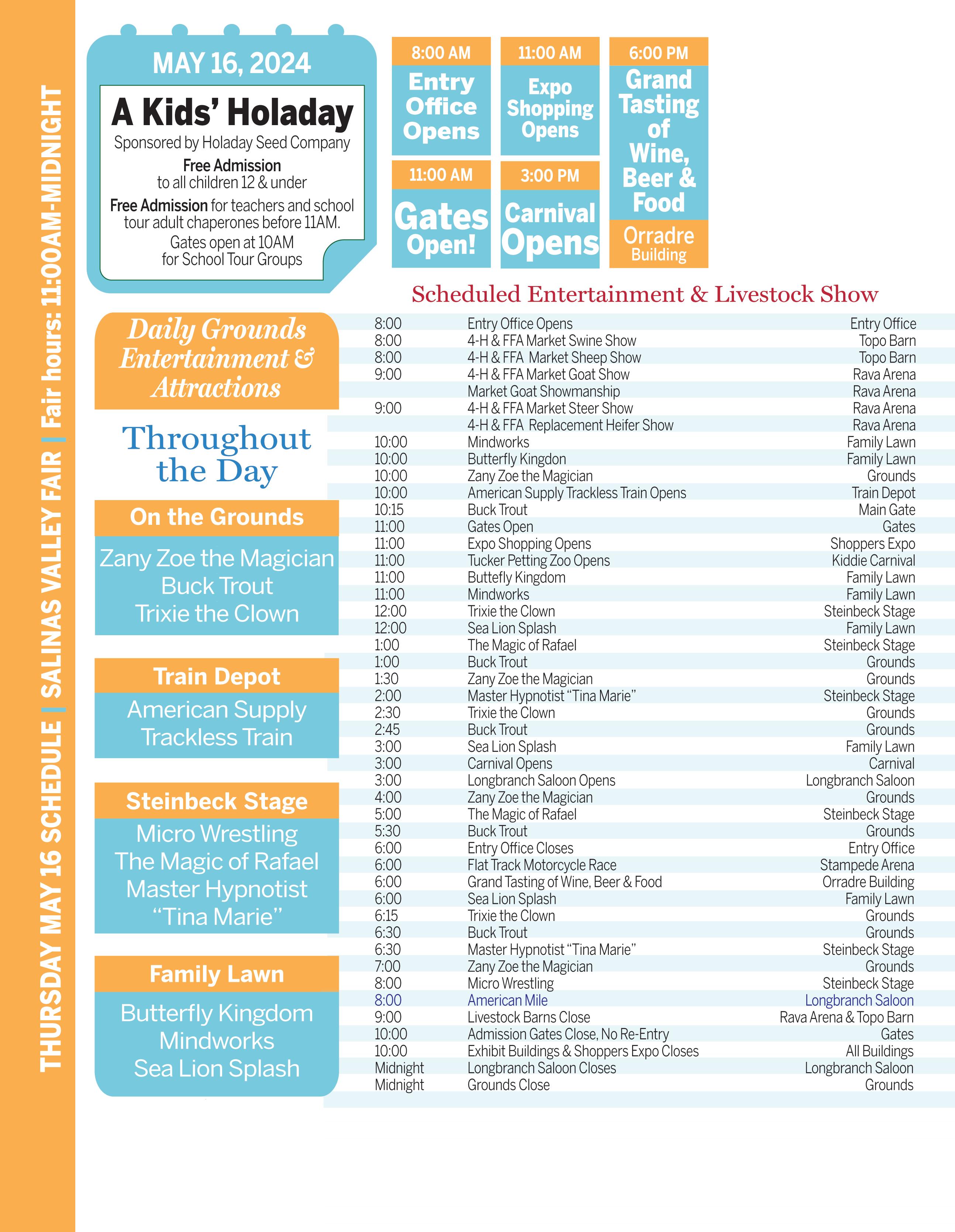 Gates Open 11AM-10PM Daily Fair Closes 12AM; 10PM Sunday www.SalinasValleyFair.com