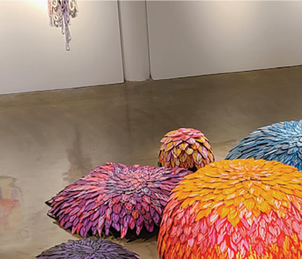 Although continuing to paint, Atta’s current focus is on sculptures created from recycled cardboard. A museum installation version of “The Upcycled Garden,” his vividly colored cardboard celebration of natural forms that was first seen at Oakland’s UMA Gallery, will be installed in St. Louis’ The City Museum in February. This version of “The Upcycled Garden” will combine both existing installations, and add larger works as well, using the recycling output of the institution.