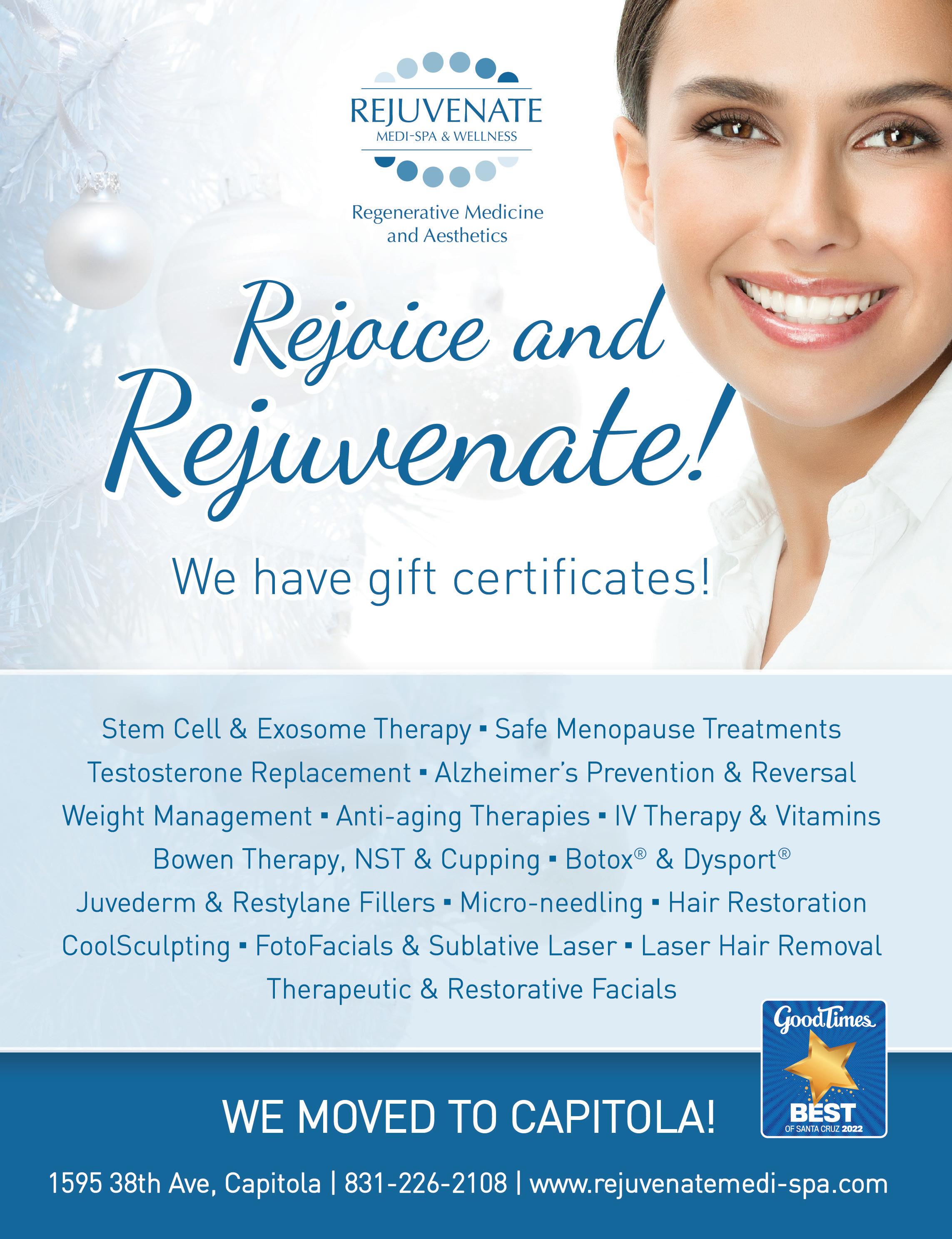 2022 | GOODTIMES.SC | SANTA CRUZ GIFT GIUDE 15 LASER HAIR & SKIN SOLUTIONS NEW ANTI-AGING TREATMENTS! 831-689-9830 783 Rio Del Mar Blvd. Suite 71B, Aptos, CA 95003 Dr. James Kojian MD | Karen Welsh RN | Nina Kolbe RN | Rachel Beauregard RN Fractional Co2 Resurfacing Customizable Rf Microneedling To Increase Collagen Vbeam Perfecta Laser for Rosacea Laser Hair Removal 50% Off 2nd Area DYSPORT | BOTOX | DERMAL FILLERS | B12 SHOTS Gift Certificates Available OYC’s captains are licensed and insured, and theTeam O’Neill is inspected annuallybythe U.S. Coast Guard. SAILOYC.COM Weekly afternoon and sunset sails Regatta viewing cruises Local beer and wine tastings Seasonal fireworks sails catamaran sailing in SANTA CRUZ Give the gift of sailing! Give the gift of sailing! Gift certificates available for sailing on the NEW LUXURY 65' TEAM O’NEILL! Public sailing season offered annually April through October. Private charters available all year for special occasions. (831) 818-3645