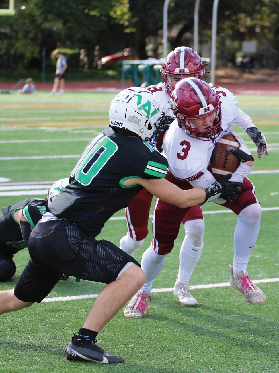 that put them in position to score again—but led by the unflagging and tenacious play of the Hounds’ front four, the Falcons had to settle for a field goal. The Falcons recovered a surprise onside kick that led to their next touchdown, and though their extra point was blocked, their lead increased to 29-14. Again, with the resolve of coach Rosales and a determined Hounds’ team, Healdsburg was anything but deflated. Perrill quickly connected with a succession of two longyardage completions to Romero, the second for a touchdown, and with 2:07 left in the third quarter, the score was 29-21. In the fourth quarter,