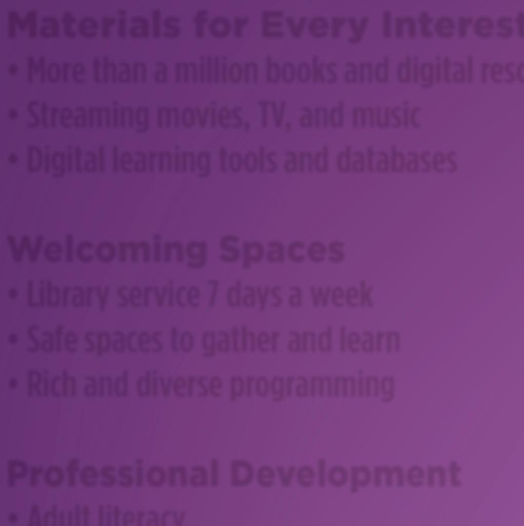 throughout the reopened library. The floor plan offers a sneak preview of some of the major changes to the layout, including a singleservice desk, new restrooms, adjustments to the shelving layout, and exciting changes to our teen and children’s areas, as well as a remodeled Wine Library and Millie Howie Patio.