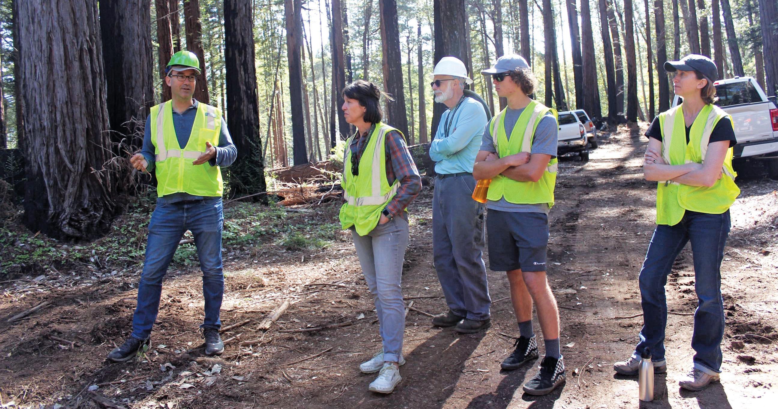 While meeting in the scorching heat at Trinity Bible Church in Felton on a recent Friday afternoon, a group was awaiting a tour of Fall Creek where they’d receive a history lesson about the complex interplay between tan oaks, Douglas fir and coast redwoods over the centuries—and about the technology that could guide their growth in the years to come.